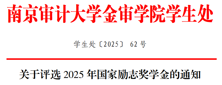 根据《省教育厅关于做好2025年普通高校国家奖学金国家励志奖学金有关工作的通知》(苏教助函〔2025〕5 号)和《南京审计大学金审学院国家励志奖学金评审实施细则》的相关精神,现就我校2025年国家励志奖学金评选工作通知如下: