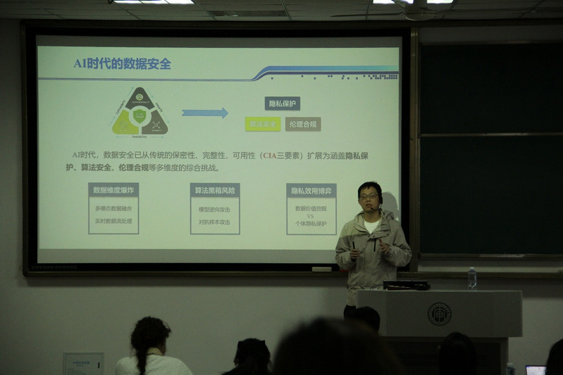 在“AI时代的数据安全”板块,芮立副教授梳理了传统CIA三要素(保密性、完整性、可用性)向“隐私保护+算法安全+伦理合规”的扩展逻辑。他结合多模态数据融合、模型逆向攻击等实例,解析当前行业面临的“数据维度爆炸”“算法黑箱风险”“隐私效用博弈”三大核心矛盾,并强调:“AI数据安全的本质,是在数据价值挖掘与个体隐私保护间寻找动态平衡。”