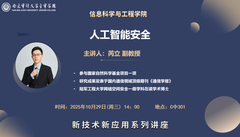 10月29日下午,信息科学与工程学院“新技术新应用系列讲座”之“人工智能安全”专题分享会在C中301教室顺利举行。本次讲座由芮立副教授主讲,聚焦AI时代的安全风险与防护前沿,吸引了学院相关专业师生参与。