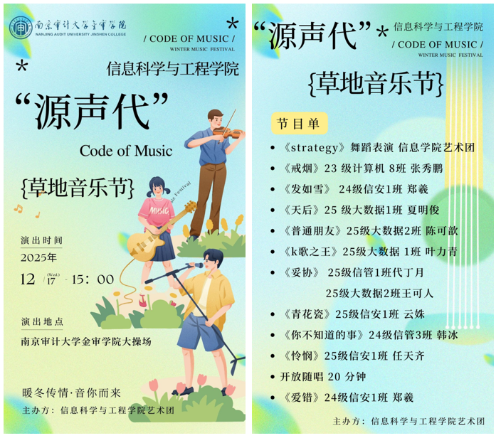 12月17日下午3时,南京审计大学金审学院大操场乐声悠扬、气氛热烈,由信息科学与工程学院艺术团主办的“源声代”草地音乐节在此活力开演。活动持续约一个半小时,吸引了众多学子自发参与,现场气氛活跃,成为冬日校园里一道动人的风景线。