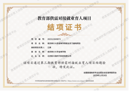 近日,南京审计大学金审学院信息学院与北京新大陆时代教育科技有限公司合作共建的就业实习基地项目(教育部第三期供需对接就业育人项目)顺利结项。该项目聚焦区域人工智能产业发展与人才需求,通过校企联动,构建了产教深度融合、供需精准对接的人才培养平台,为培养具有跨界整合能力的创新型人才探索出可行路径。